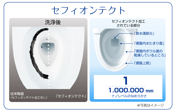 陶器表面の凹凸を100万分の1mmのナノレベルでなめらかに仕上げられ、汚れが付きにくく落ちやすいTOTO独自の技術加工。純度の高いガラス層を約1200℃の窯でじっくり焼き付けたことで、美しさが持続!!