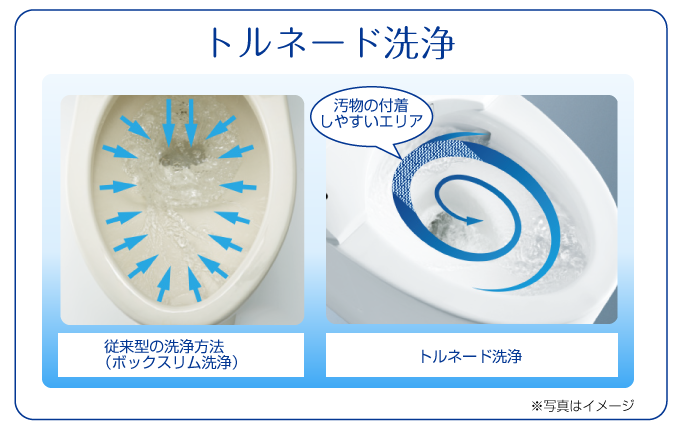 渦を巻くようなトルネード洗浄が、少ない水で、汚れをしっかり洗い流します♬