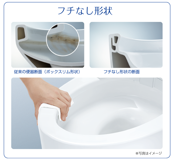汚れが見えにくく、たまりやすいフチをなくした便器形状。お掃除はサッとひとふきで完了♬