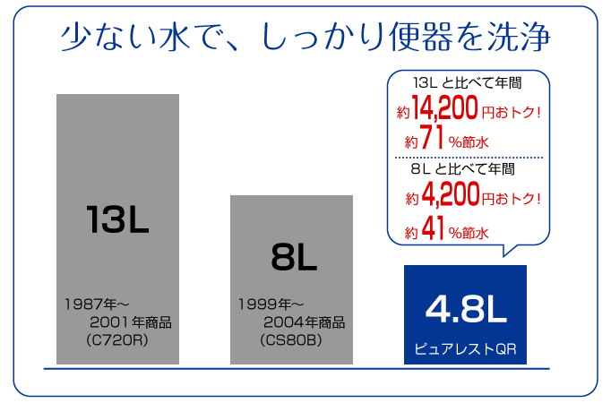 1回あたりの洗浄水量がわずか4.8L。13L便器からおよそ1/3、8L便器からおよそ3/5と、大幅な節水を実現しました。毎日普通に使っているだけで、いつの間にか大きな節約効果があります♬